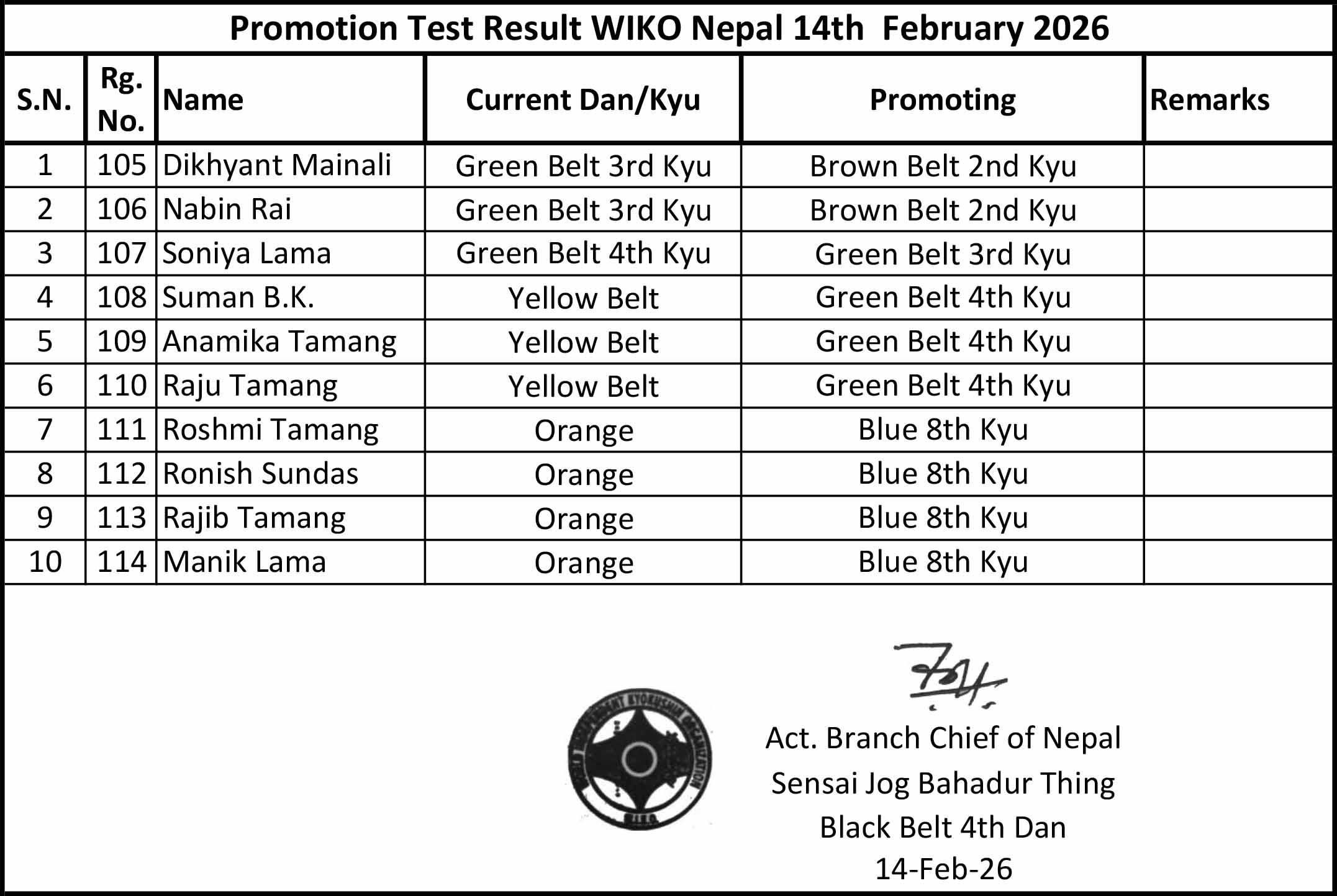 केन्द्रिय समितिको कार्यबहाक अध्यक्ष तथा सहायक ब्रान्च चिफ श्री जोग बहादुर थिङले  W.I.K.O. नेपालको पाचौं प्रमोशन टेस्ट लिनु भयो । उक्त टेस्टको तिजा तपशिमा उल्लेख गरिएको छ ।